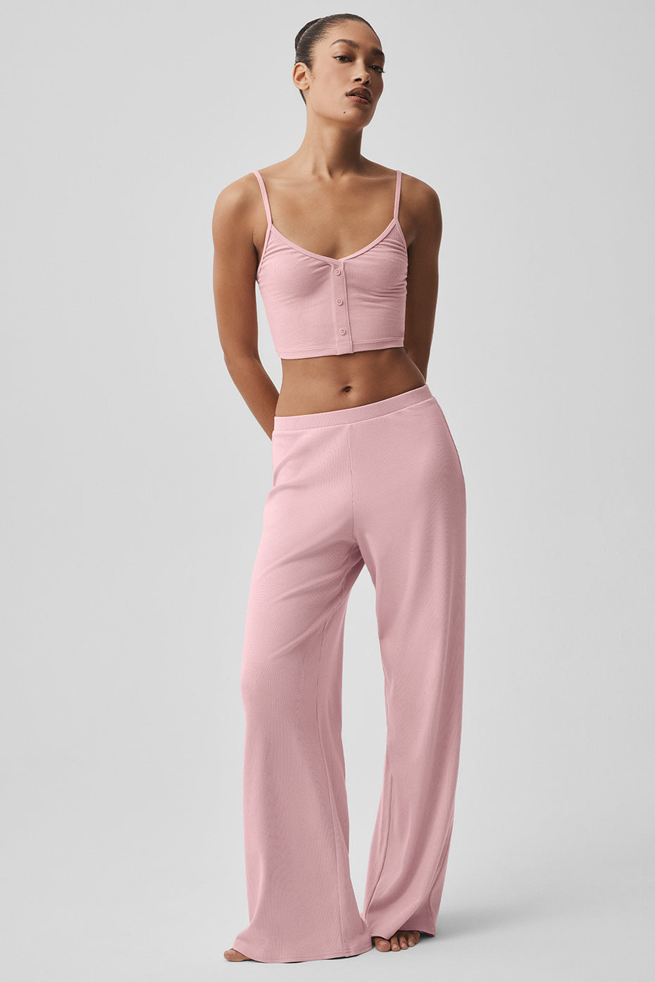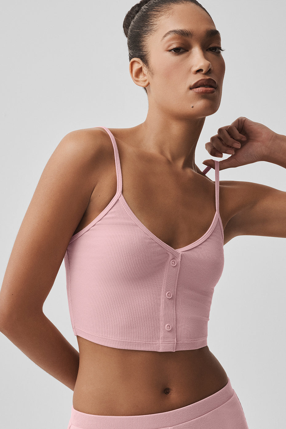 The Ribbed Delicate Lounge Tank is where comfort meets polish. Made from a soft, textured rib knit that moves with you, this cropped silhouette features a flattering V-neckline, delicate straps, and fixed buttons down the front. From mat to matcha runs, this style was made for you. Pair it with the Semi-Sheer Delicate Lounge Flare Pant for the perfect look.